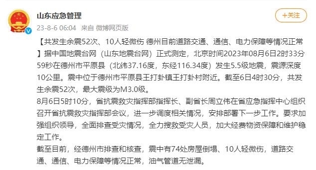 截至目前,經(jīng)德州市排查和核查,震中有74處房屋倒塌、10人輕微傷,道路交通、通信、電力保障等情況正常,油氣管道無(wú)泄漏。