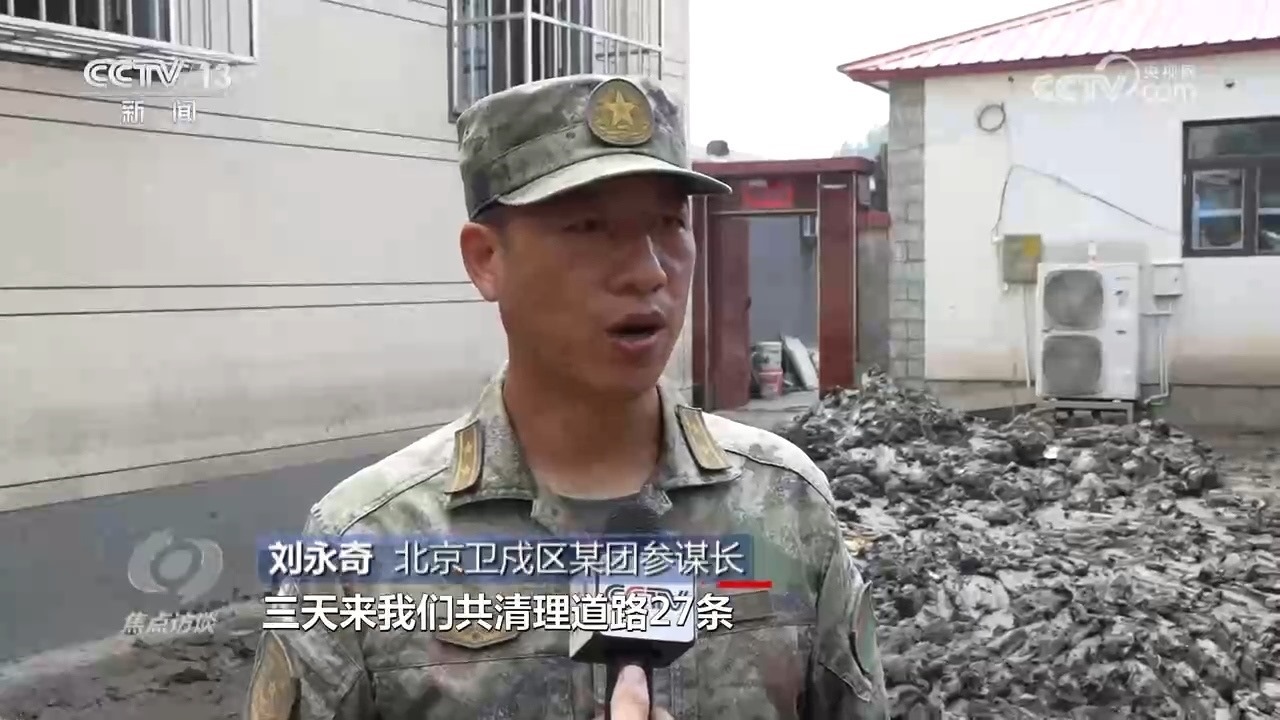 北京衛(wèi)戍區(qū)某團(tuán)參謀長(zhǎng)劉永奇:“三天來(lái),我們共清理道路27條,面積28000余平方米,淤泥700余立方米,廢舊垃圾1300余立方米,全面疏通了各條道路。”