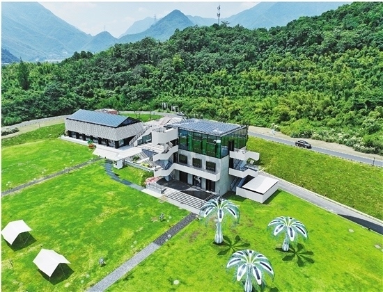 圖為余村未來(lái)圖書館,該建筑主要通過(guò)鋪設(shè)在屋頂上的光伏發(fā)電系統(tǒng)和“光伏樹”供電(無(wú)人機(jī)照片)。新華社記者 翁忻旸 攝