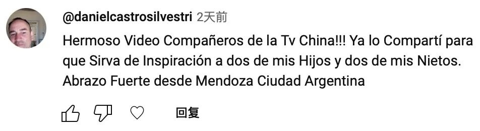 網(wǎng)友danielcastrosilvestri:“中國電視臺的朋友們,這個視頻太好看了!?。∥野阉窒沓鋈?,希望它能夠給我的兩個孩子和兩個孫子帶來啟發(fā)。我來自阿根廷的門多薩市,致禮。”