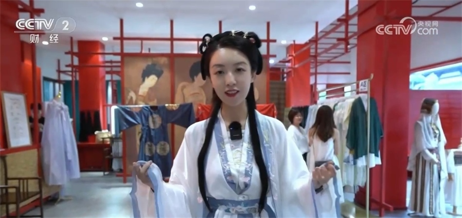 總臺央視記者 劉藝涵:沉浸式古鎮(zhèn)之旅一定少不了換裝體驗(yàn),也是不少游客來到這里首選的項(xiàng)目。目前,園區(qū)內(nèi)像這樣的古裝店共有7家,提供租賃、銷售、化妝造型和攝影等服務(wù)?,F(xiàn)在我身上的這件就是店里的一款經(jīng)典的漢服,全天的租賃價(jià)格是199元。