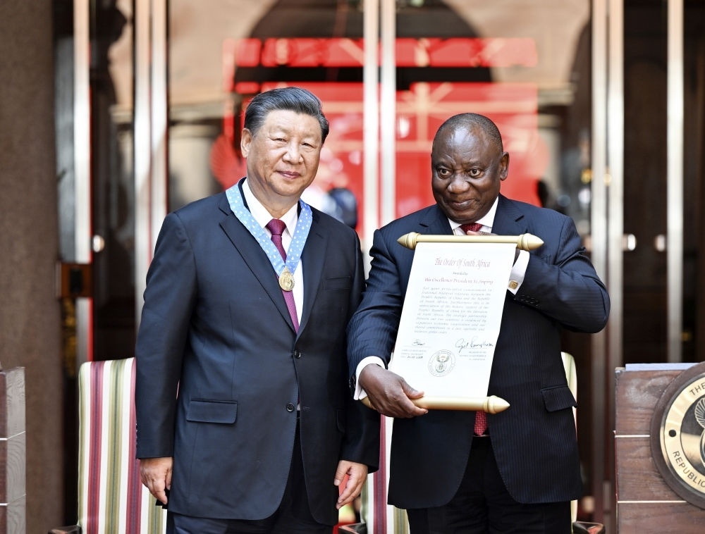 會(huì)談后,拉馬福薩向習(xí)近平授予“南非勛章”,這是南非授予重要友好國(guó)家元首的最高級(jí)別勛章和最高榮譽(yù)。