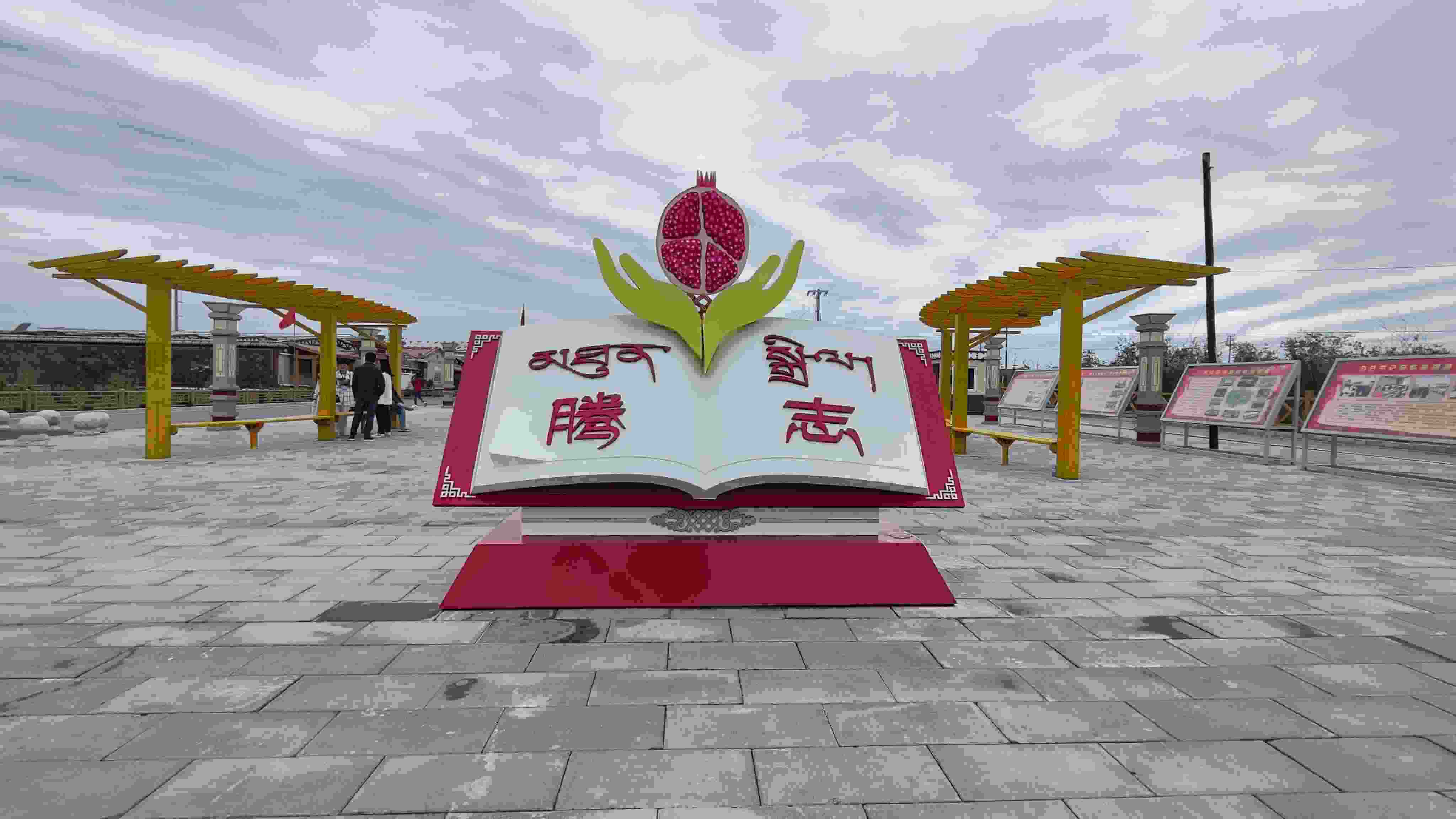 這些向好的變化離不開每一位村民的團(tuán)結(jié)友愛、互幫互助。村口的廣場(chǎng)中間有一本打開的書,書頁(yè)上一雙手托舉著一個(gè)鮮艷的石榴,這就是果洛藏貢麻村新修建的“騰志”廣場(chǎng)。“騰志”在藏語中意為“團(tuán)結(jié)”,這也寓意著各民族像石榴籽一樣緊緊抱在一起,共育團(tuán)結(jié)花,共享幸福果。