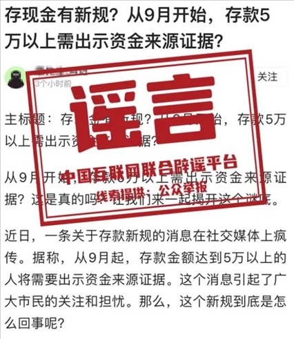 ·9月起所有大額存款須出示特定證明材料?央行辟謠:不實信息。