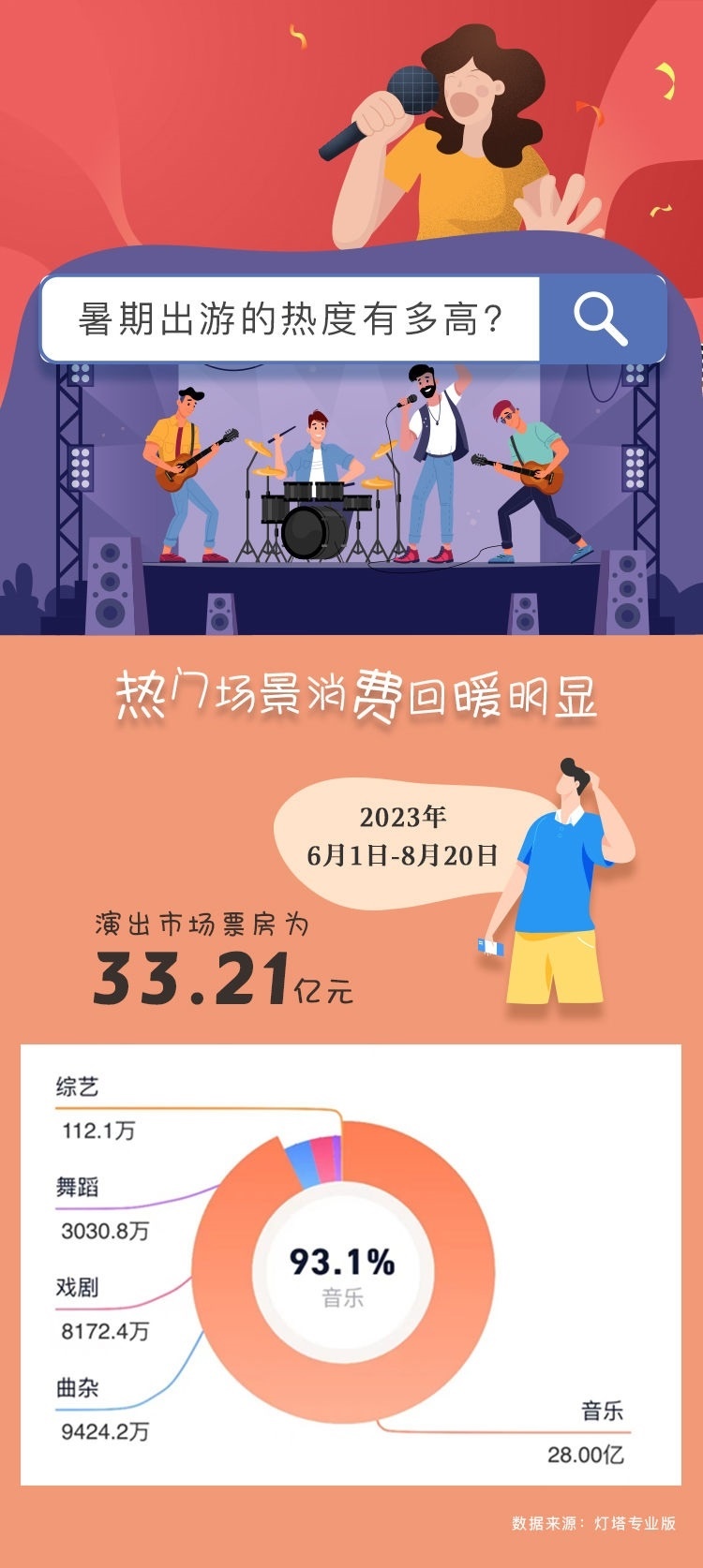作為演出市場(chǎng)的傳統(tǒng)旺季,暑假期間演唱會(huì)、Live house、戲劇、音樂劇等各類熱門演出“一票難求”。根據(jù)燈塔專業(yè)版最新數(shù)據(jù),暑期檔中的6月1日至8月23日演出市場(chǎng)票房已經(jīng)超過30億元,而相當(dāng)可觀的跨城觀演比例,更引得除了演出票房之外的周邊產(chǎn)業(yè)一起火?!耙粋€(gè)演出圈粉一座城”,當(dāng)?shù)芈糜谓?jīng)濟(jì)不斷涌現(xiàn)新的可能。