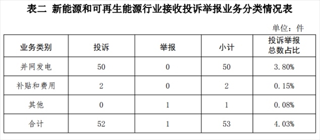 新能源和可再生能源行業(yè)排在第二位,數(shù)量為53件、占投訴舉報總數(shù)的4.03%,主要集中在并網(wǎng)發(fā)電、補貼和費用等方面。