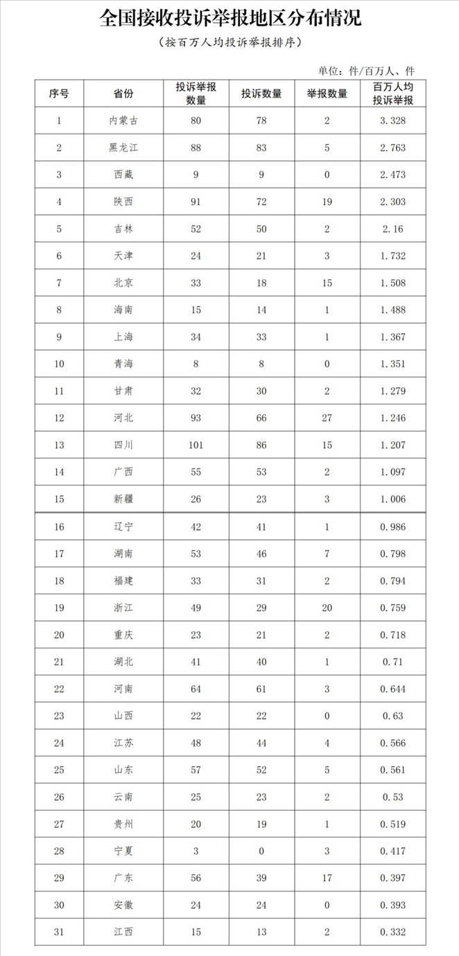 各?。ㄗ灾螀^(qū)、直轄市)按照接收投訴舉報數(shù)量排序,四川、河北、陜西、黑龍江、內蒙古排在全國前5位。其中:按投訴數(shù)量排序,四川、黑龍江、內蒙古、陜西、河北排在全國前5位;按舉報數(shù)量排序,河北、浙江、陜西、廣東、北京(四川并列)排在全國前5位;按百萬人均投訴舉報數(shù)量排序,內蒙古、黑龍江、西藏、陜西、吉林排在全國前5位。(全國接收投訴舉報地區(qū)分布情況詳見附件1)