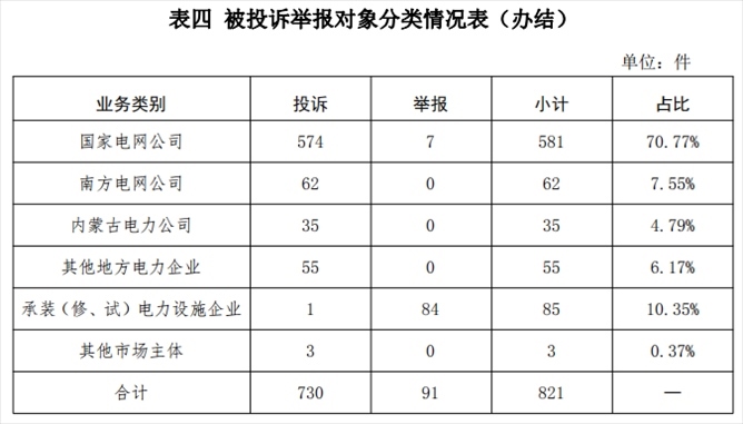 從被投訴舉報對象看,供電企業(yè)733件、占投訴舉報總數(shù)的89.28%,其中國家電網(wǎng)公司581件、占比70.77%,南方電網(wǎng)公司62件、占比7.55%,內蒙古電力公司35件、占比3.65%,其他地方電力企業(yè)55件、占比6.17%;承裝(修、試)電力設施企業(yè)85件、占比10.35%;其他市場主體3件、占比0.37%。