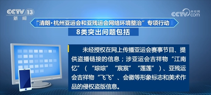 未經(jīng)授權(quán)在網(wǎng)上傳播亞運會賽事節(jié)目、提供盜播鏈接的信息;涉亞運會吉祥物“江南憶”(“琮琮”“宸宸”“蓮蓮”)、亞殘運會吉祥物“飛飛”、會徽等形象標(biāo)志和美術(shù)作品的侵權(quán)盜版信息。