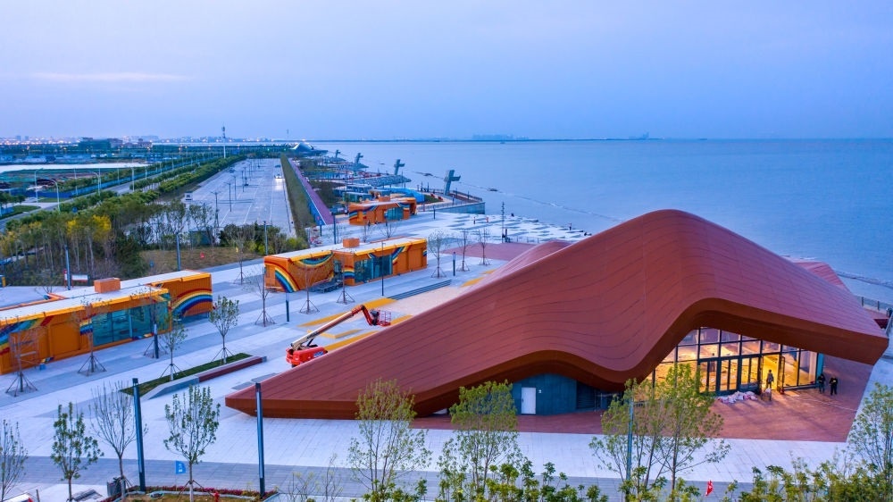 從淺灘向岸上望去,一只面朝大海的“貝殼”、一座沿海岸線起伏的“沙丘”和一架巨大的“紙飛機”映入眼簾,在這三座造型別致的游客服務中心建筑之間,冰飲、小吃等小攤店鋪星羅棋布。