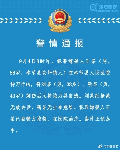 ·重慶奉節(jié)一男子在醫(yī)院持刀行兇致一死一傷,警方通報。