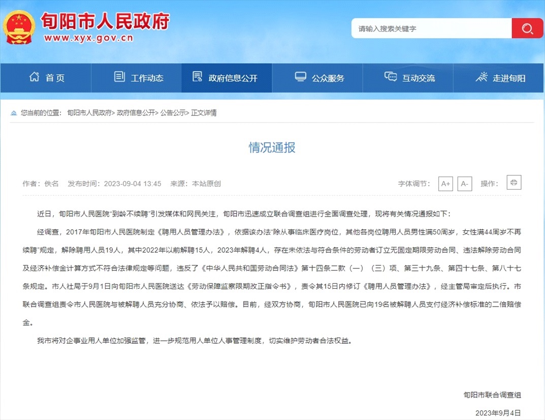 ·陜西旬陽一醫(yī)院規(guī)定“到齡不續(xù)聘”,旬陽市政府回應:責令限期改正,支付兩倍賠償。
