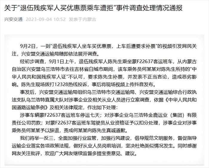 ·興安盟交通運輸局通報“退伍殘疾軍人買優(yōu)惠票乘車遭拒”:涉事乘務員被辭退。