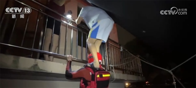 在轉移另一處被困人員時,救援人員搭起人梯,讓被困群眾踩著自己的肩膀轉移。