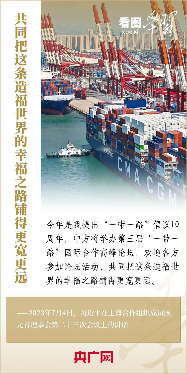2013年金秋,習(xí)近平主席開創(chuàng)性提出共建“絲綢之路經(jīng)濟帶”和“21世紀(jì)海上絲綢之路”,即“一帶一路”倡議。十年來,共建“一帶一路”倡議從共商共建共享的“大寫意”,到精謹(jǐn)細(xì)膩的“工筆畫”,影響力和感召力不斷擴大。在“一帶一路”倡議提出10周年之際,《看圖學(xué)習(xí)》為您梳理習(xí)近平主席的一系列重要論述。一起來學(xué)習(xí)!
