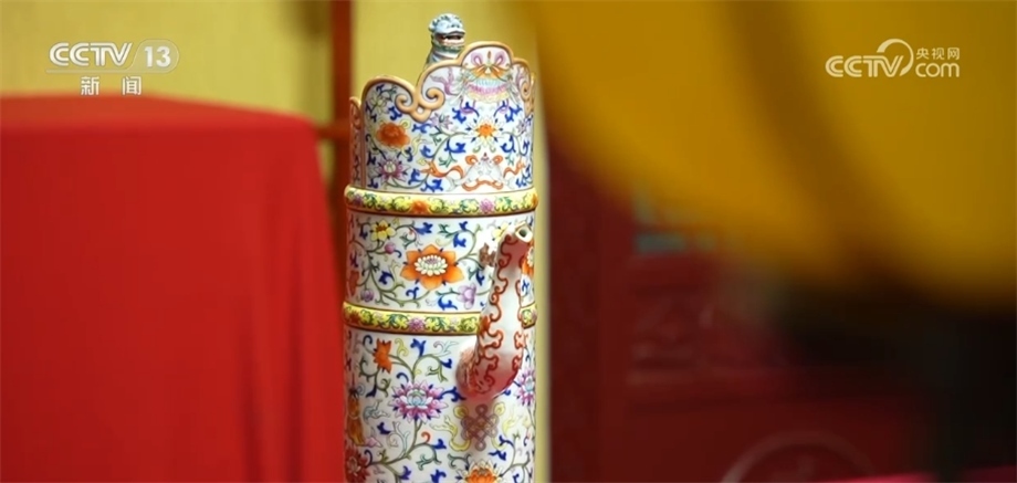總臺(tái)記者 楊雪:沈陽(yáng)故宮當(dāng)中的很多珍貴院藏文物都見證了多民族文化融合的過(guò)程,像我們眼前看到的這款清乾隆款粉彩多穆壺就是其中之一。多穆在藏語(yǔ)當(dāng)中是奶茶桶的意思,直到現(xiàn)在,像銅制、木制、皮質(zhì)的很多多穆壺仍然被蒙、藏等少數(shù)民族沿襲使用著。大家可以看到,這款多穆壺的蓋子上蹲坐著一只非常靈動(dòng)的小獅子,有祈福和護(hù)佑主人的意思。這件多穆壺是國(guó)家一級(jí)文物,距今已經(jīng)有200多年的歷史了。