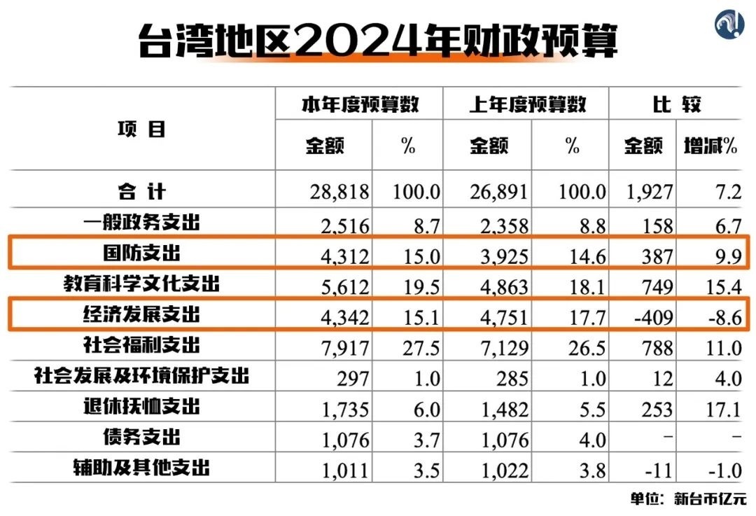民進(jìn)黨當(dāng)局不久前通過的2024年財政預(yù)算案就很能說明問題。各項支出中,防務(wù)支出繼續(xù)保持增長,經(jīng)濟(jì)發(fā)展支出卻是所有領(lǐng)域中跌幅最大的。