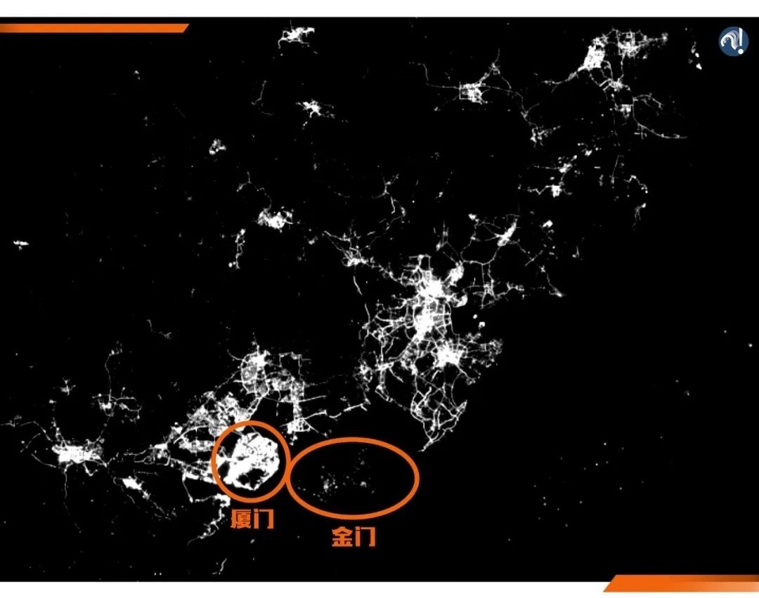 這是福建周邊的夜光遙感地圖??梢钥吹剑驮趶B門被點亮的時候,金門卻是一片漆黑。與此同時,金門的發(fā)展也有個特點,那就是靠近大陸的地方更亮。