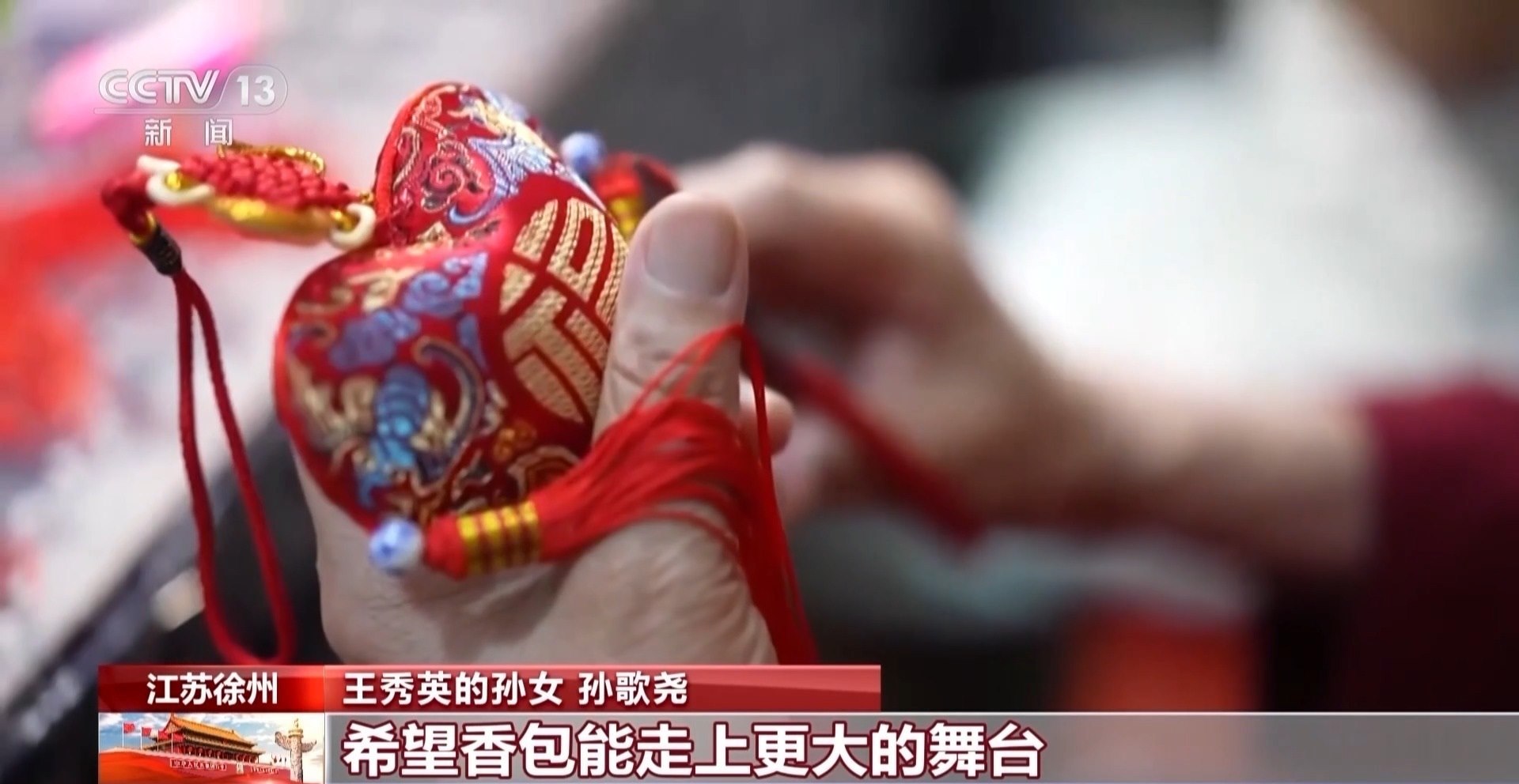 王秀英的孫女 孫歌堯:我奶奶是第三代傳承人,她已經(jīng)做了70多年了,到我這里是第五代,我覺得我也是有必要把它傳承下去。希望香包能走上更大的舞臺(tái),能走出徐州,走向世界。