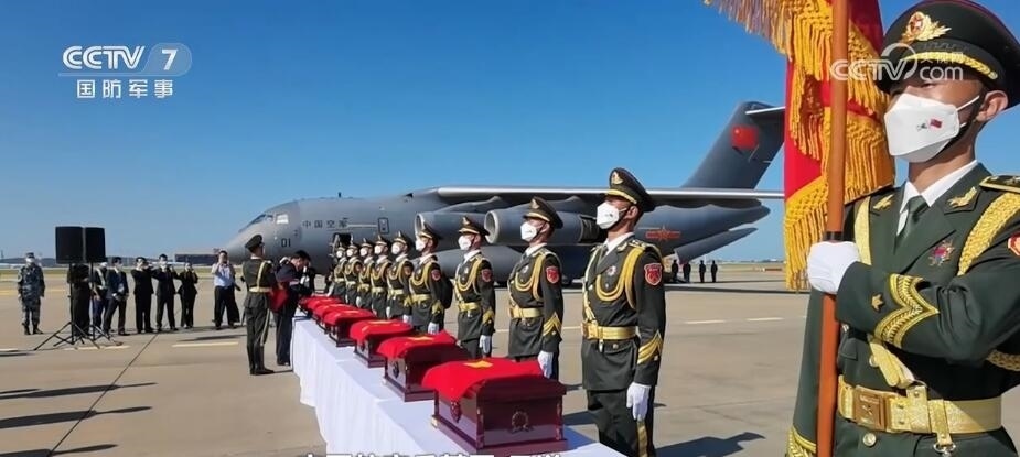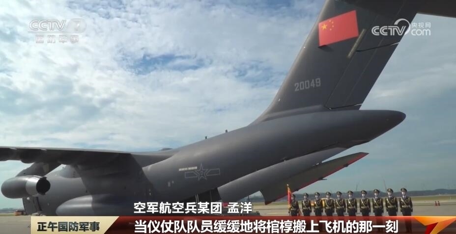 空軍航空兵某團 孟洋:當時在儀式的現場,我們機組成員是列隊在飛機的后艙位置,準備迎接烈士遺骸上飛機。當儀仗隊隊員緩緩地將棺槨搬上飛機的那一刻,我看著一面面國旗覆蓋在棺槨上,直到那一刻,我才更加深刻地理解我們國旗的顏色是由無數革命先烈鮮血染成的。