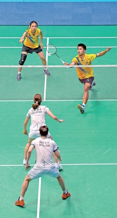 10月4日,杭州亞運(yùn)會羽毛球混合雙打1/8決賽,馬來西亞體育代表團(tuán)組合對陣泰國體育代表團(tuán)組合。圖為雙方運(yùn)動員在比賽中。本報(bào)記者 伊霄攝