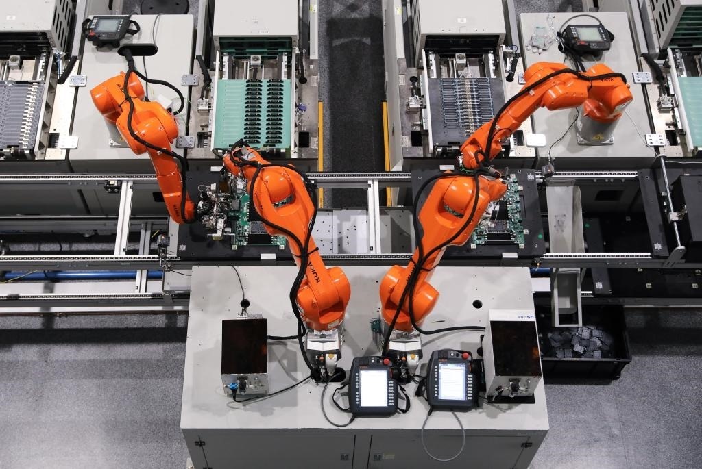 5月22日,在杭州紫光恒越(杭州)技術(shù)有限公司“未來工廠”,機械臂在工作中。新華社記者 杜瀟逸 攝