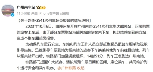 ·廣州南站通報(bào)高鐵超員報(bào)警:部分到站旅客未下車,擬繼續(xù)乘車到前方站。