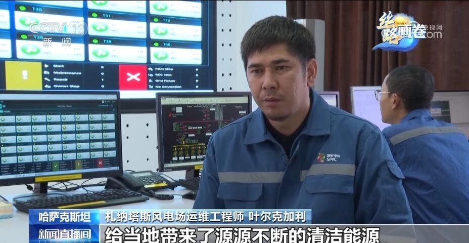 總臺(tái)記者 張譽(yù)耀:這里就是札納塔斯,哈薩克斯坦最大的風(fēng)力發(fā)電場(chǎng)之一,像我身后這樣一座風(fēng)能發(fā)電機(jī)能滿(mǎn)足當(dāng)?shù)丶s4000戶(hù)家庭的用電需求,而我身后一共有40座這樣的風(fēng)能發(fā)電機(jī),也就是說(shuō)能夠滿(mǎn)足當(dāng)?shù)?6萬(wàn)戶(hù)家庭的用電需求。正是這一座座轉(zhuǎn)動(dòng)的風(fēng)能發(fā)電機(jī),點(diǎn)亮了札納塔斯這座小城的日常生活。
