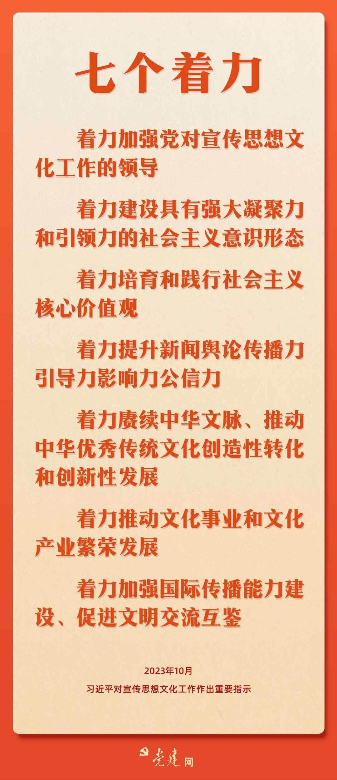 10月7日至8日,全國宣傳思想文化工作會議在京召開。會議傳達了習近平總書記對宣傳思想文化工作的重要指示,并首次提出習近平文化思想。快來一圖學習會議精神要點!