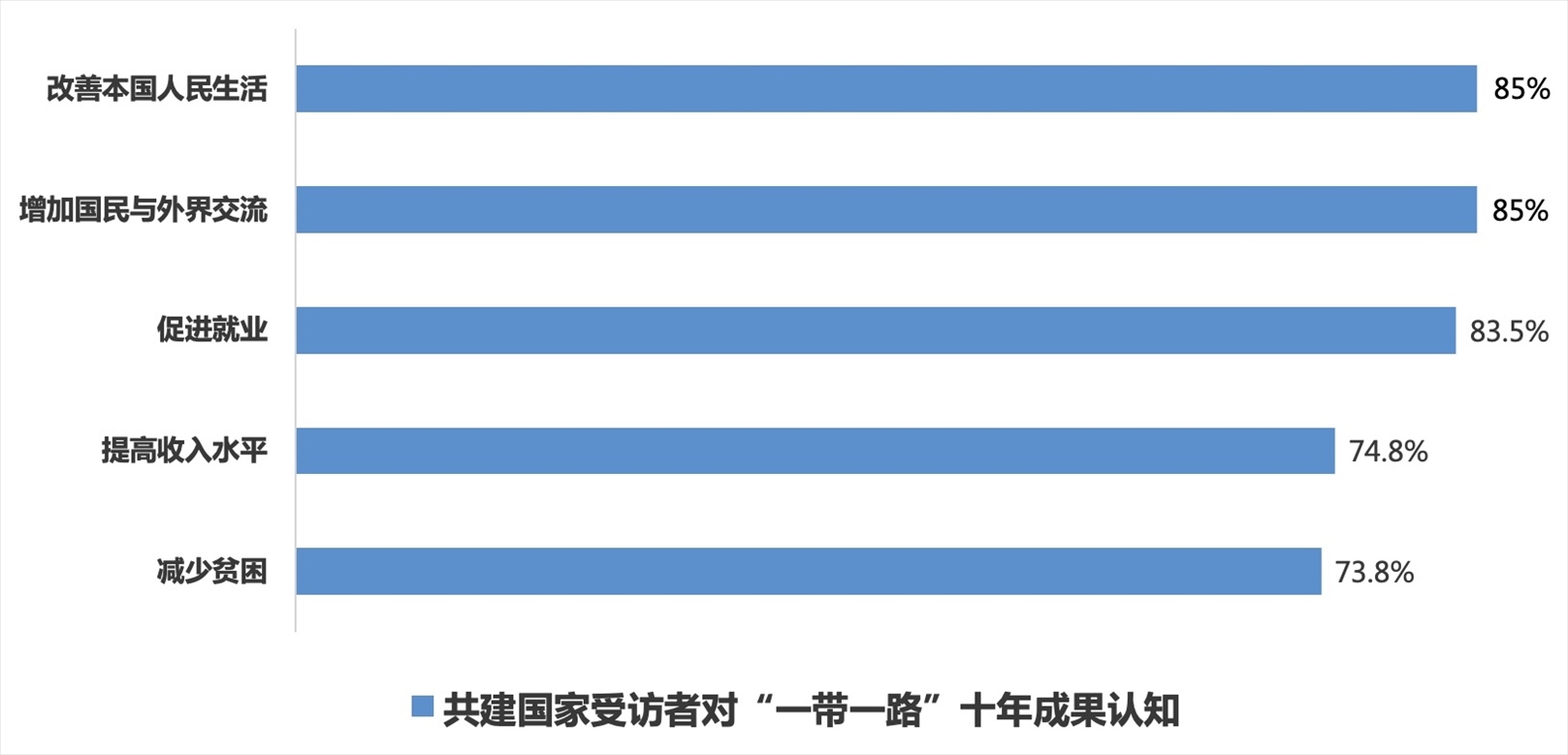 “一帶一路”倡議下一個個“惠而實”的民生工程、民心工程,為各國人民帶來實實在在的獲得感、幸福感和安全感,85%的共建國家受訪者認為“一帶一路”切實改善了本國人民的生活;85%的共建國家受訪者認為通過“一帶一路”民眾獲得了更多與外界交流互鑒的機會;分別有83.5%、74.8%和73.8%的共建國家受訪者認可共建“一帶一路”在促進就業(yè)、提高居民收入水平和減少貧困方面的作用;86.5%的共建國家受訪者認為“一帶一路”倡議和“以人民為中心”的理念高度契合,惠及全球民眾的愿景正在逐步變?yōu)楝F(xiàn)實。