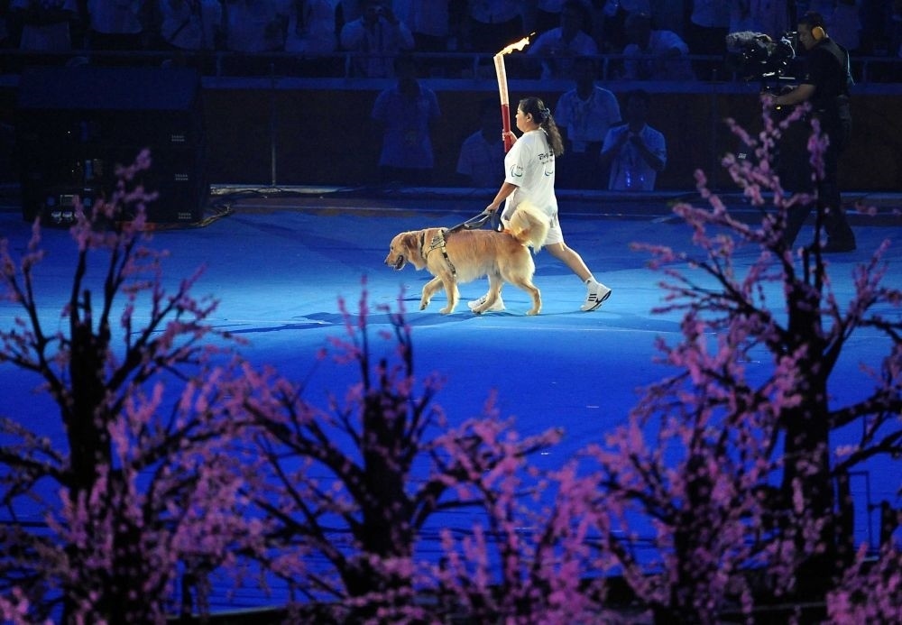 2008年9月6日,北京2008年殘奧會開幕式在國家體育場隆重舉行,火炬手平亞麗在進行火炬?zhèn)鬟f。新華社記者王頌攝