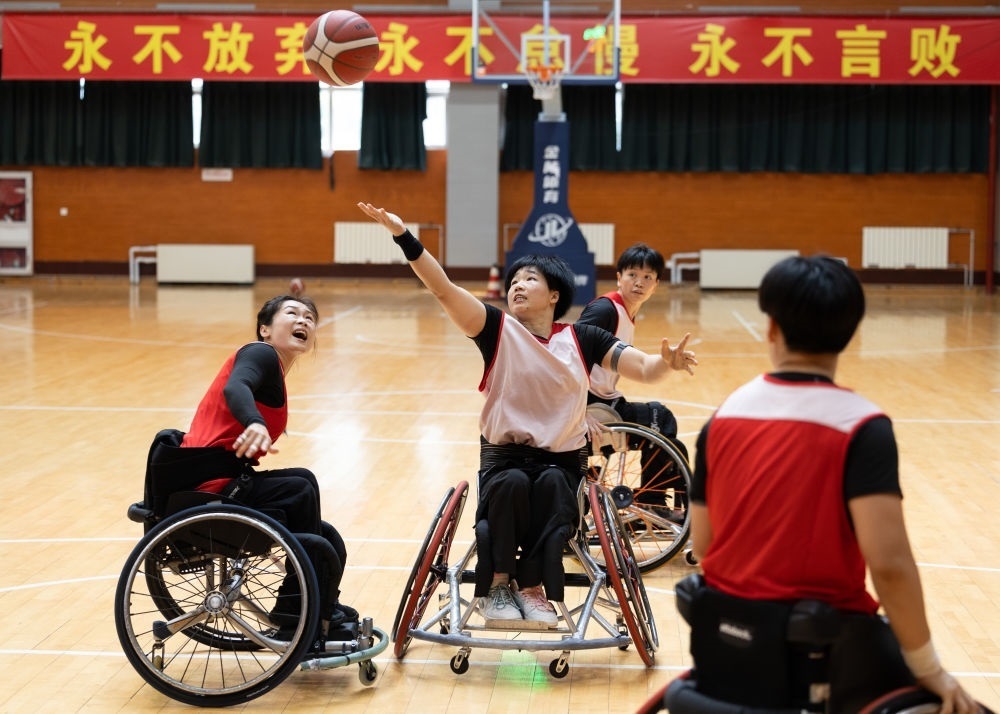 這是2023年8月31日,黃曉連(左二)在中國殘疾人體育運(yùn)動管理中心訓(xùn)練。新華社記者 才揚(yáng) 攝