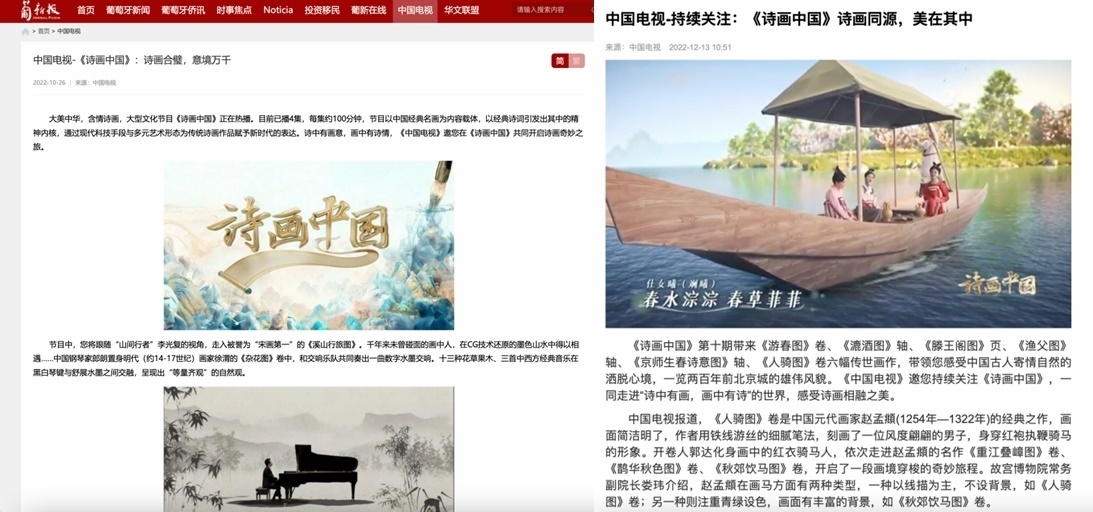 同時(shí),《詩畫中國》在傳播上也達(dá)到了節(jié)目內(nèi)外的同頻共振,成功讓華夏文明輻射至全世界。在美國《國際日報(bào)》網(wǎng)站和社交媒體賬號、法國《歐洲時(shí)報(bào)》網(wǎng)站和App、俄羅斯《龍報(bào)》網(wǎng)站和世界頭條App“北極熊視野”賬號等華文新媒體平臺(tái)上,節(jié)目相關(guān)內(nèi)容廣受歡迎。在2022“非洲伙伴”媒體合作論壇上,《詩畫中國》還作為總臺(tái)優(yōu)秀作品進(jìn)行了展示。日前于戛納影節(jié)宮舉辦的第六屆WISDOM in CHINA中國原創(chuàng)節(jié)目模式推介會(huì)上,節(jié)目更是以中國原創(chuàng)之名,登上了Mipcom主舞臺(tái)。