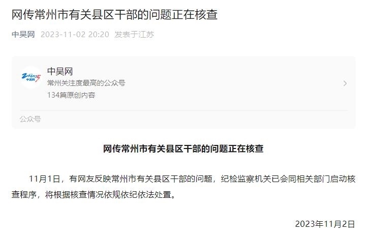 央視網(wǎng)消息:據(jù)“中吳網(wǎng)”微信公眾號消息,11月1日,有網(wǎng)友反映常州市有關(guān)縣區(qū)干部的問題,紀(jì)檢監(jiān)察機(jī)關(guān)已會(huì)同相關(guān)部門啟動(dòng)核查程序,將根據(jù)核查情況依規(guī)依紀(jì)依法處置。