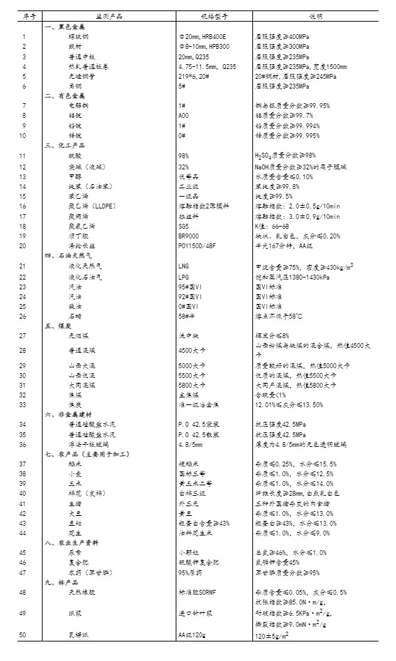 流通領(lǐng)域重要生產(chǎn)資料市場價格監(jiān)測內(nèi)容包括9大類50種產(chǎn)品的價格。類別與產(chǎn)品規(guī)格說明詳見附表。