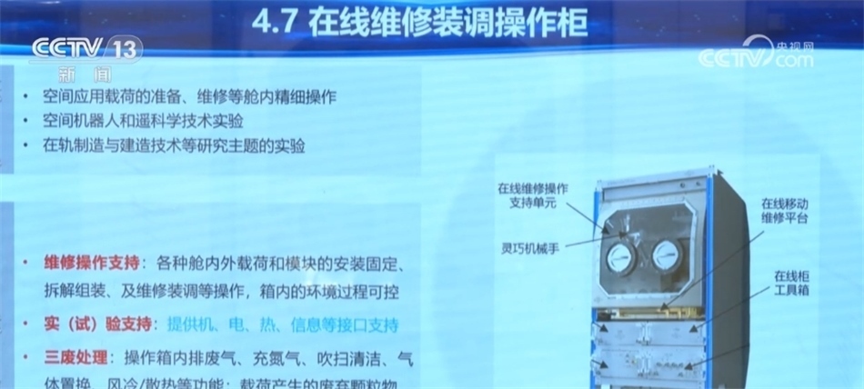 在中國空間站的艙內艙外有大量的設備,這些設備一旦出現(xiàn)故障該怎么處理呢?我國科研人員創(chuàng)新性地研發(fā)了一套“在線維修裝調操作柜”,有了它,空間站的實驗設備和載荷一旦出現(xiàn)故障,就可以在軌進行維修。下面記者就帶我們一起來了解這個中國空間站的設備維修“利器”。