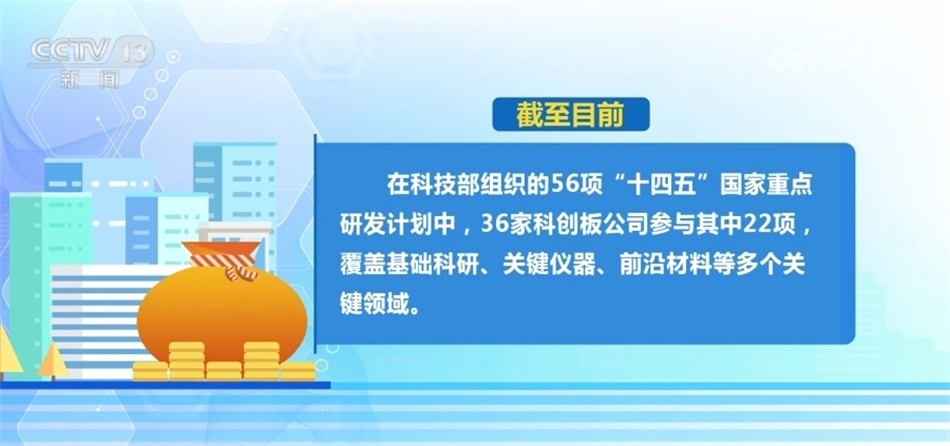 ?????? 截至目前,在科技部組織的56項(xiàng)“十四五”國(guó)家重點(diǎn)研發(fā)計(jì)劃中,36家科創(chuàng)板公司參與了其中22項(xiàng),覆蓋了基礎(chǔ)科研、關(guān)鍵儀器、前沿材料等多個(gè)關(guān)鍵領(lǐng)域。