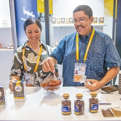 在食品及農(nóng)產(chǎn)品展區(qū),南非參展商展示當(dāng)?shù)靥禺a(chǎn)蜜樹茶。本報記者 張武軍攝