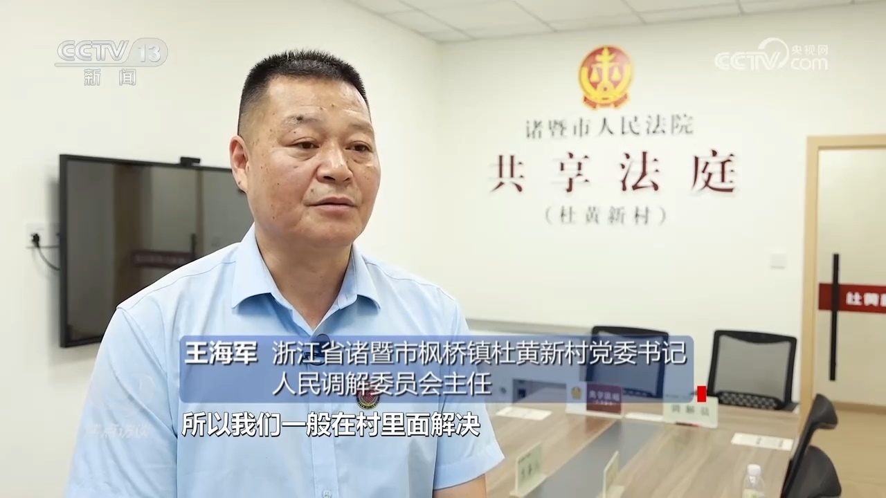 浙江省諸暨市楓橋鎮(zhèn)杜黃新村黨委書記、人民調解委員會主任王海軍:“村里一般的調解村兩委會以及村調委基本上就地解決,因為‘楓橋經驗’矛盾不出村,所以我們一般在村里面解決。但是涉及到法律法規(guī)一塊或者有些老百姓在‘心結’上面解不開,我們就動用共享法庭。”