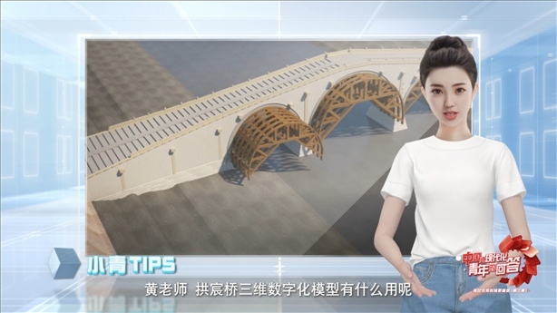 作為黃碩的好幫手,AI數(shù)字人小青給大家介紹說,三維動(dòng)畫中,展現(xiàn)了拱宸橋從選址、圍堰到打樁、搭建、填碎石的全過程,拱宸橋三維數(shù)字化項(xiàng)目成為大運(yùn)河保護(hù)傳承利用的案例之一。