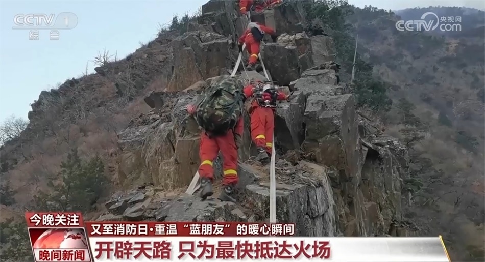 今年四月份,一處起火點在海拔3800多米的峭壁懸崖,為盡快滅火,最快的路線就是要翻越這段坡度超過70度的山脊。山脊寬不足米,左右兩側(cè)都是百米深的斷崖。負責開路的消防員只能用手指扣住石縫,雙腳登著石頭,把臉和軀干緊貼山體向上攀爬。在危險重重的絕壁上硬生生地開辟出了一條救援天路。二百多名消防員夜以繼日,在高海拔缺氧的環(huán)境下,每天背著將近40斤重的滅火機具往返于這條天路之上,奔赴火場。整整十個晝夜的撲救,山火終于被撲滅。
