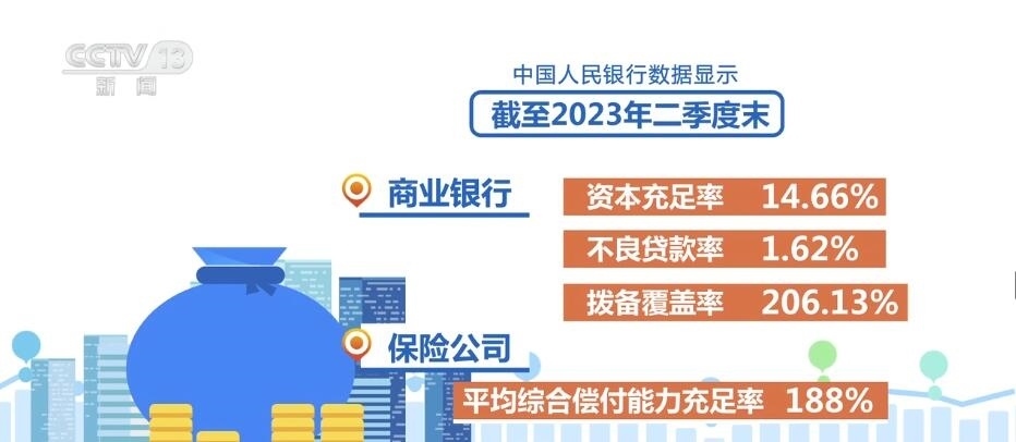 中國人民銀行數(shù)據(jù)顯示,截至2023年二季度末,商業(yè)銀行資本充足率、不良貸款率和撥備覆蓋率分別為14.66%、1.62%和206.13%,保險(xiǎn)公司平均綜合償付能力充足率188%,證券公司風(fēng)險(xiǎn)覆蓋率、平均資本杠桿率分別為255.38%、18.78%,信用風(fēng)險(xiǎn)處于可控水平,損失抵御能力總體較為充足。