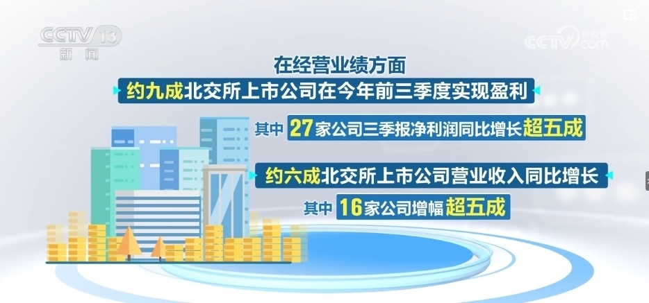 在經(jīng)營業(yè)績方面,約九成北交所上市公司在2023年前三季度實(shí)現(xiàn)盈利。其中,27家公司三季報(bào)凈利潤同比增長超五成。約六成北交所上市公司營業(yè)收入同比增長,其中,16家公司增幅超五成。