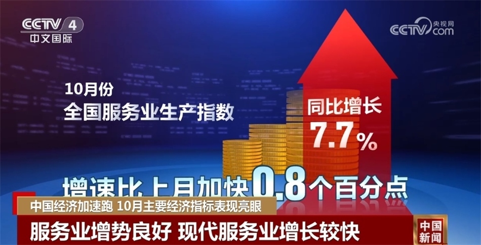 再來看服務業(yè)。服務業(yè)增勢良好,現(xiàn)代服務業(yè)增長較快。10月份,服務業(yè)生產指數同比增長7.7%,比上月加快0.8個百分點。其中,住宿和餐飲業(yè)、批發(fā)和零售業(yè)、交通運輸倉儲和郵政業(yè)等聚集型服務業(yè)都保持兩位數增長。