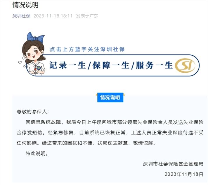·深圳社保局回應停發(fā)失業(yè)保險金短信:信息系統(tǒng)故障,已恢復正常。