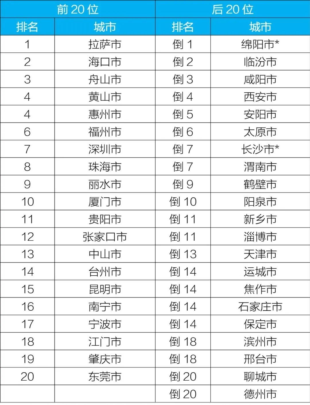10月,168個重點城市中,空氣質(zhì)量排名前20位城市依次是拉薩、貴陽和舟山等城市(從第1名至第20名);空氣質(zhì)量排名后20位城市依次是臨汾、安陽和新鄉(xiāng)等城市(從倒數(shù)第1名至并列倒數(shù)第20名)。見附表1。