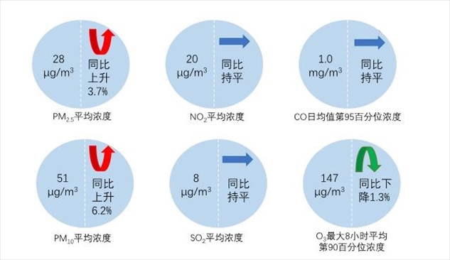 1—10月,全國339個地級及以上城市平均空氣質(zhì)量優(yōu)良天數(shù)比例為85.1%,同比下降1.2個百分點,較2019年同期上升2.9個百分點;平均重度及以上污染天數(shù)比例為1.6%,同比上升0.8個百分點,較2019年同期下降0.1個百分點;PM2.5平均濃度為28微克/立方米,同比上升3.7%,較2019年同期下降17.6%;O3平均濃度為147微克/立方米,同比下降1.3%,較2019年同期下降2.6%;PM10平均濃度為51微克/立方米,同比上升6.2%;SO2平均濃度為8微克/立方米,同比持平;NO2平均濃度為20微克/立方米,同比持平;CO平均濃度為1.0毫克/立方米,同比持平。