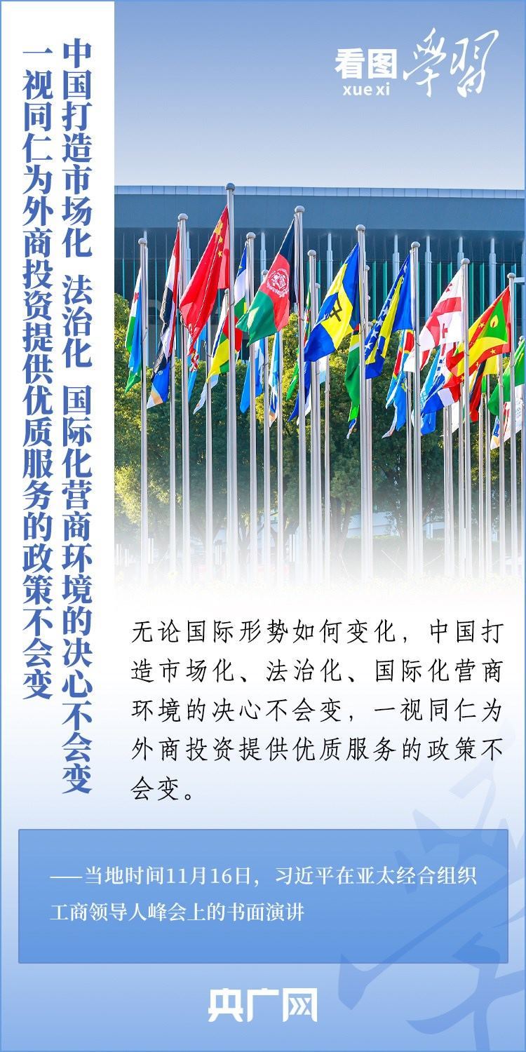 當(dāng)?shù)貢r(shí)間11月16日,國(guó)家主席習(xí)近平應(yīng)邀出席亞太經(jīng)合組織工商領(lǐng)導(dǎo)人峰會(huì)并發(fā)表書面演講。習(xí)主席深刻總結(jié)了亞太經(jīng)濟(jì)合作30年來非凡成就和啟示,對(duì)亞太合作下一個(gè)30年將走向何方這一新的時(shí)代之問提出中國(guó)答案,重申“中國(guó)打造市場(chǎng)化、法治化、國(guó)際化營(yíng)商環(huán)境的決心不會(huì)變,一視同仁為外商投資提供優(yōu)質(zhì)服務(wù)的政策不會(huì)變”,向全球工商界發(fā)出邀請(qǐng),歡迎“積極參與中國(guó)式現(xiàn)代化進(jìn)程,共享中國(guó)高質(zhì)量發(fā)展帶來的巨大機(jī)遇!”一起來學(xué)習(xí)。