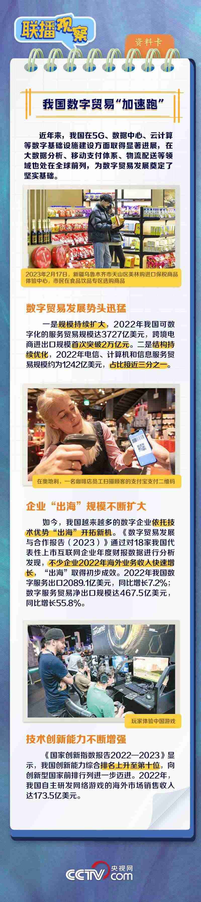 當(dāng)前,貨物貿(mào)易和服務(wù)貿(mào)易都呈現(xiàn)出不可逆的數(shù)字化轉(zhuǎn)型趨勢。什么是數(shù)字貿(mào)易?本屆數(shù)貿(mào)會有什么看點(diǎn)和亮點(diǎn)?我國數(shù)字貿(mào)易有何發(fā)展成果?央視網(wǎng)《聯(lián)播觀察》與您一同了解。