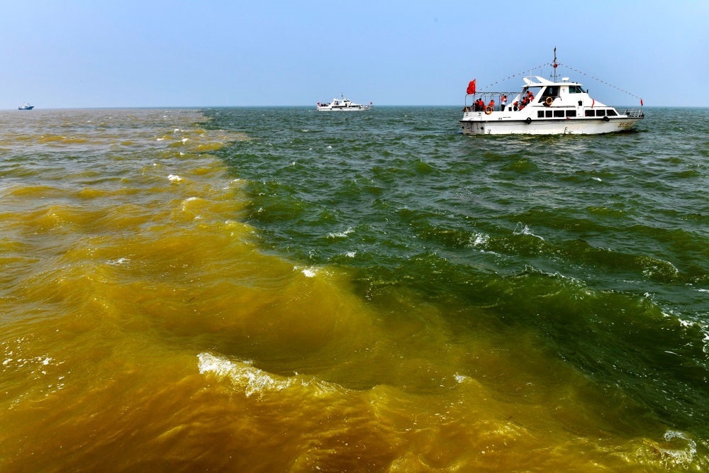 在山東省東營(yíng)市黃河入???,黃河匯入渤海,形成獨(dú)特景觀(2021年5月13日攝)。